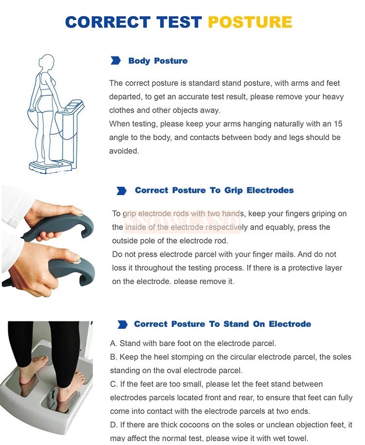 테스트 부분:왼쪽 상단쪽의 생물 전기적 임피던스 분석오른쪽 위쪽 팔다리, 몸통, 왼쪽 아래쪽 팔다리, 오른쪽 아래쪽 팔다리